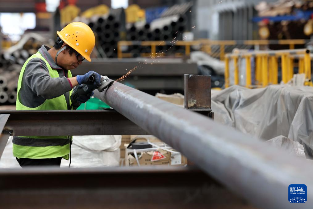 7月11日,在承德市鹰手营子矿区一家无缝钢管生产企业,工作人员在修磨气瓶管。