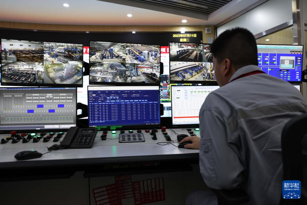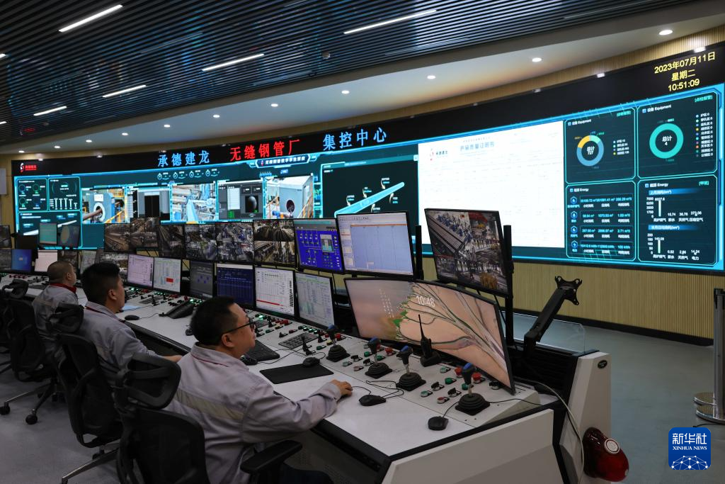 7月11日,在承德市鹰手营子矿区一家无缝钢管生产企业,工作人员在集控中心工作。