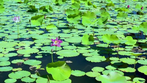 盛夏时节,在石家庄市滹沱河畔以及多处公园内,千姿百态的荷花次第盛开,吸引众多市民和游客前来观赏。只见蜻蜓立荷尖,野鸭戏叶底,池塘一片生机盎然。伴随微风拂起涟漪,荷叶摆动,莲蓬摇曳,勾勒出一幅充满诗情画意的夏日画卷。
