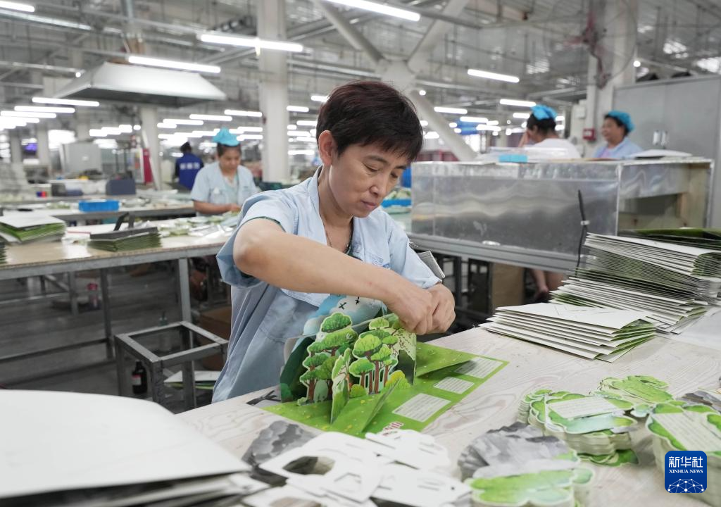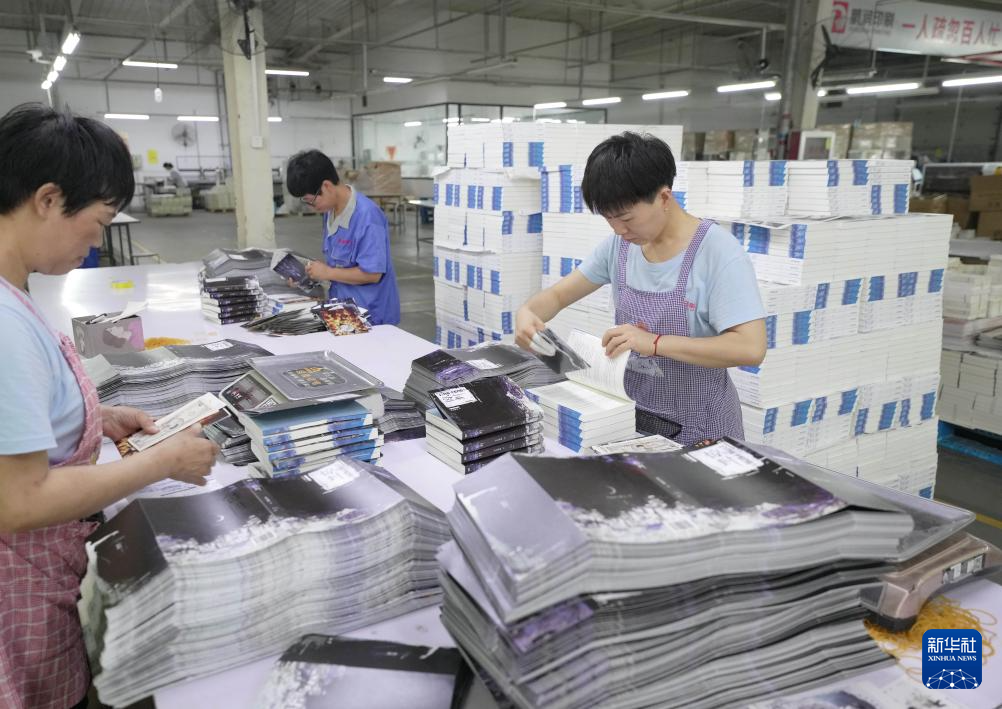 7月23日,工人在河北省肃宁县的一家图书印刷企业的装订车间工作。