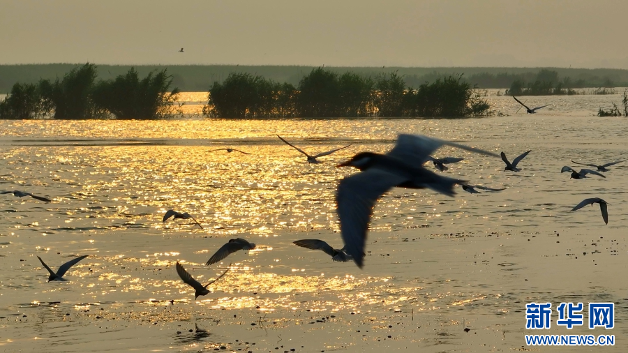 一群灰翅浮鸥在淀面上翱翔、捕食。新华网发 陈法良摄