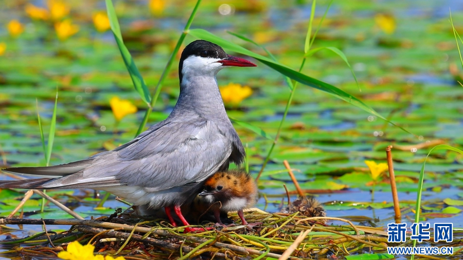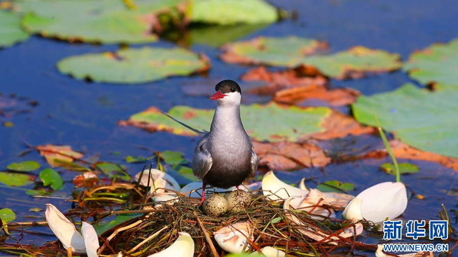 一只灰翅浮鸥在浮巢中默默守护着鸟蛋。新华网发 陈法良摄