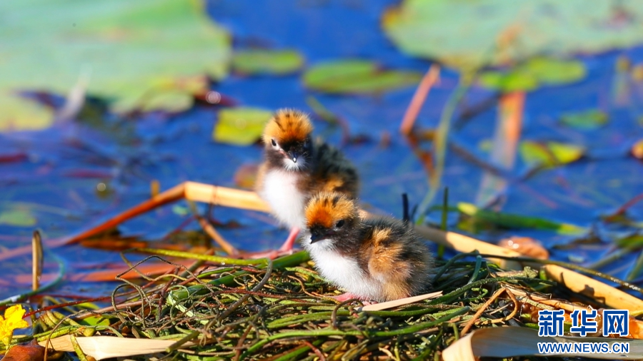 两只灰翅浮鸥“宝宝”在巢中休息。新华网发 陈法良摄