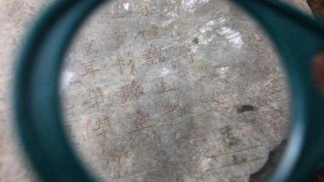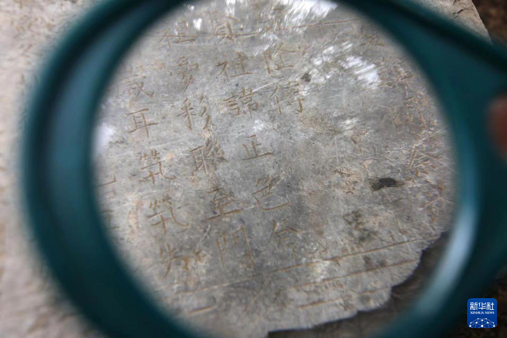 南和区文保部门工作人员在查看墓志铭上的文字。新华社记者 赵鸿宇 摄