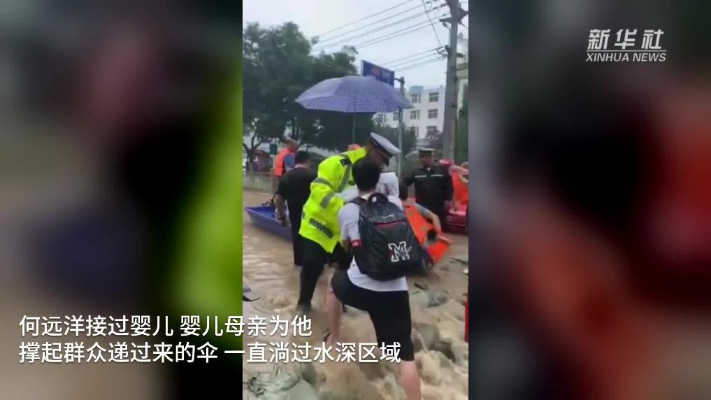 8月1日下午两点,在河北涿州范阳桥西疏导转移群众的交警何远洋发现一女子没有任何防雨措施,抱着一个襁褓中的婴儿。何远洋接过婴儿,婴儿母亲为他撑起群众递过来的伞,一直趟过水深区域。