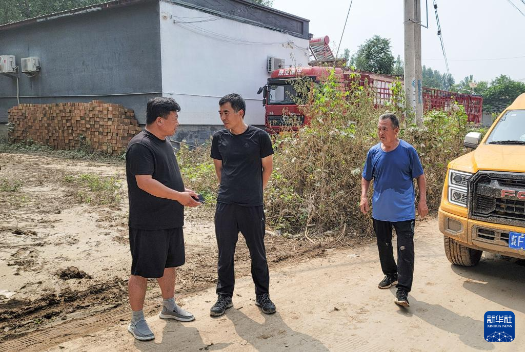 8月9日,望海庄村党支部书记杨黎颖(左一)和刁窝镇党委书记张大众(左二)在村口商议恢复供电事宜。新华社记者 苏凯洋 摄