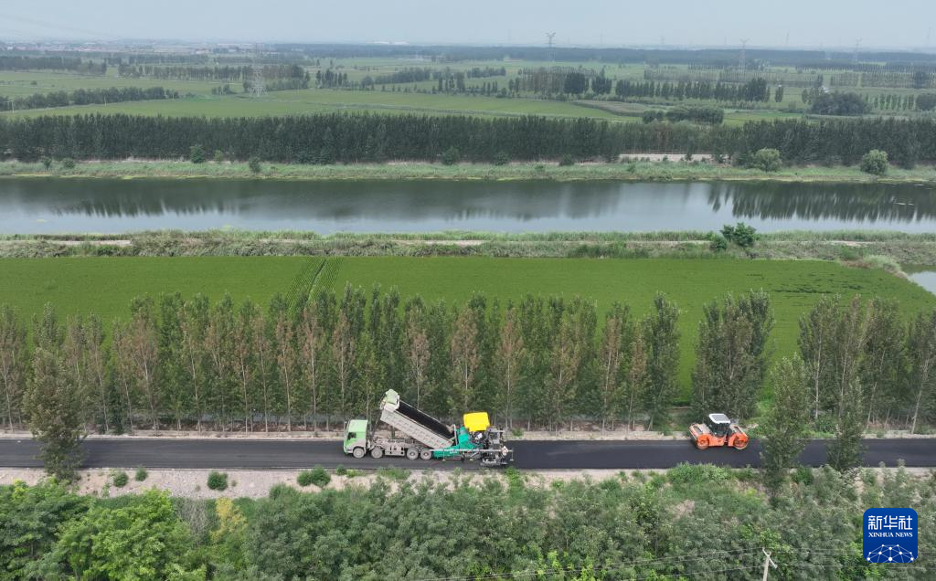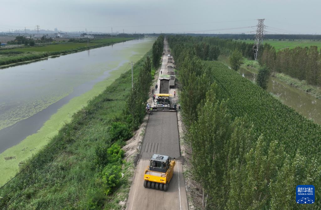 8月23日,工人在唐山市丰南区陡河沿岸乡村公路建设工地施工(无人机照片)。