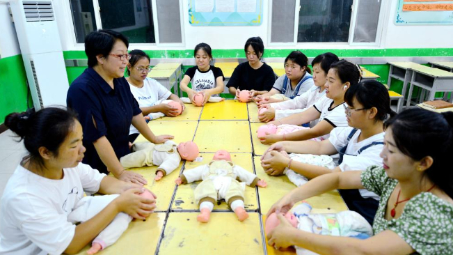 8月22日,学员们在育婴员培训班上学习抚触婴儿的手法。