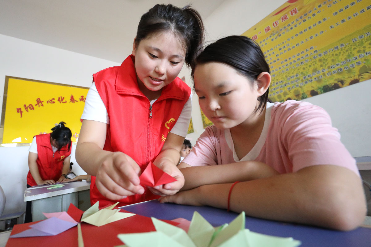 大学生志愿者教孩子们折纸。孙海峰 摄