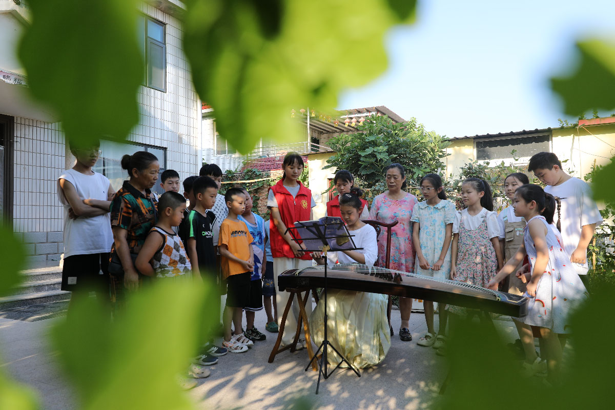 大学生志愿者教孩子们弹奏古筝。孙海峰 摄