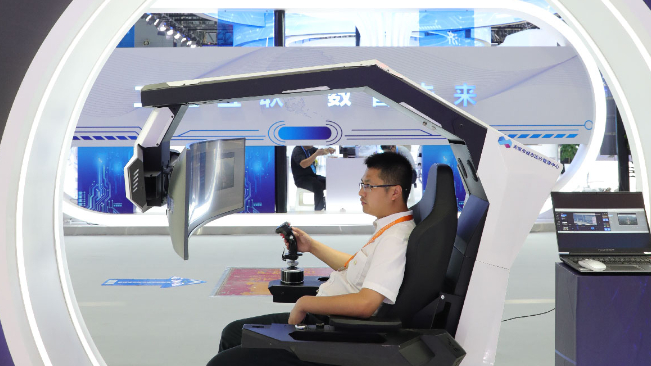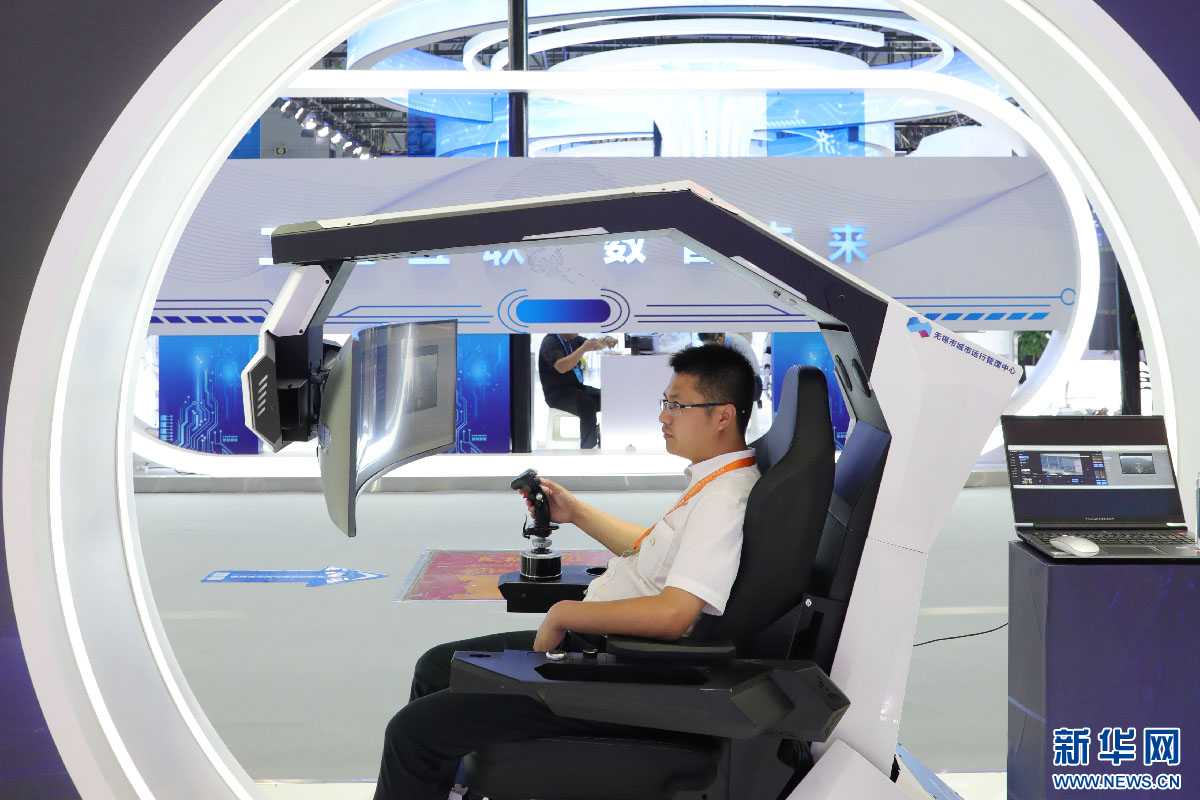 体验者通过操控手柄,现场调度异地的无人机进行空中巡查。新华网 王立鹏摄