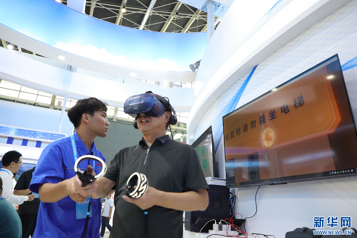 在企业展区,参观者通过VR虚拟设备体验火灾逃生。新华网 王立鹏摄
