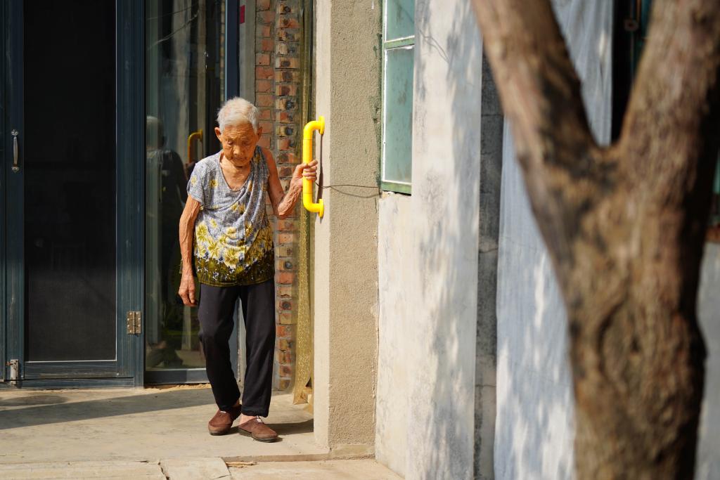 9月8日,河北省巨鹿县后辛庄村95岁的芦遂扶着适老化改造工程安装的扶手在院子里行走。