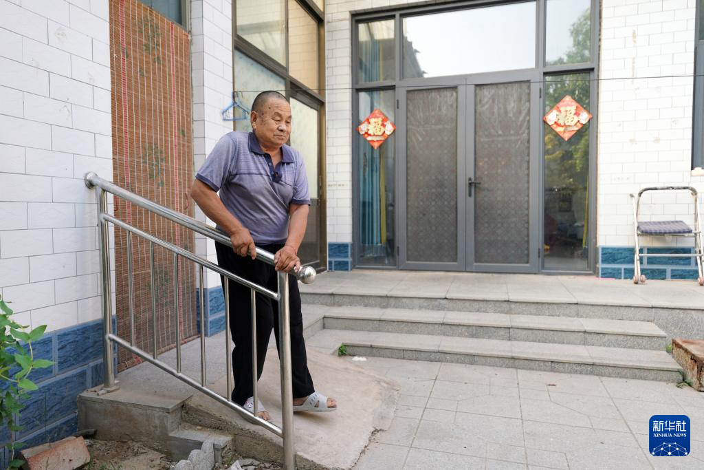 9月8日,河北省巨鹿县白寨村78岁的张廷军扶着适老化改造工程安装的扶手走出屋门。
