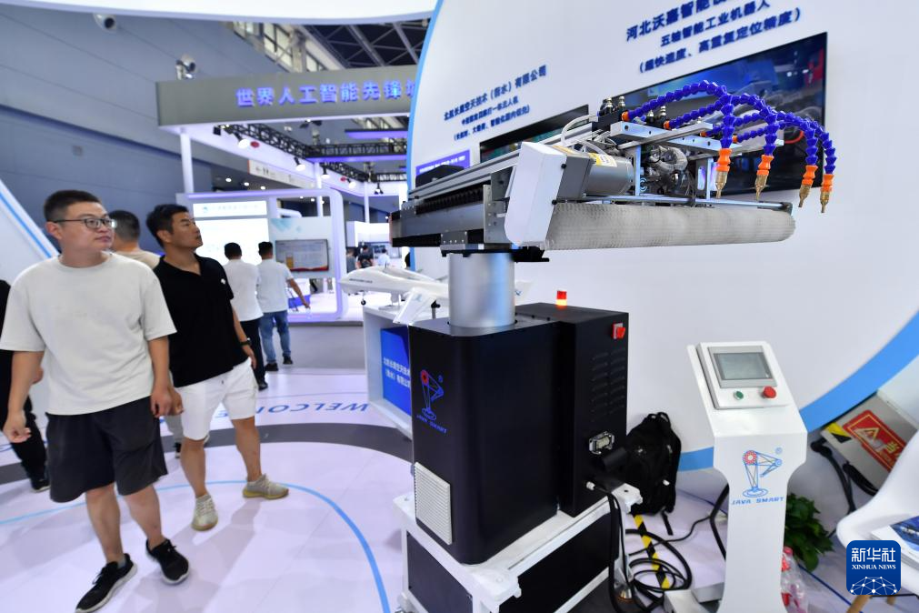 9月7日,参观者在数博会上观看五轴智能工业机器人。
