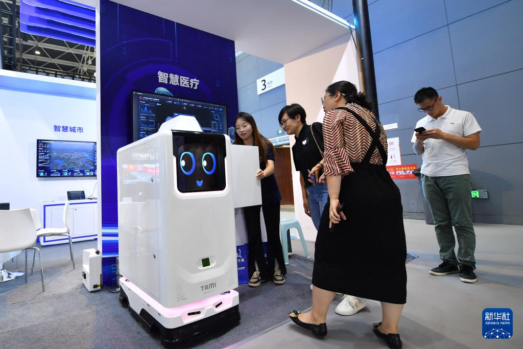 9月8日,工作人员(左一)在数博会上向参观者介绍医疗物资配送机器人。