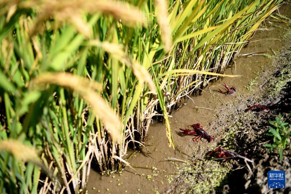 由盐碱地改良而成的乐亭县数字循环农业智慧园区稻虾共生区内的小龙虾(9月14日摄)。