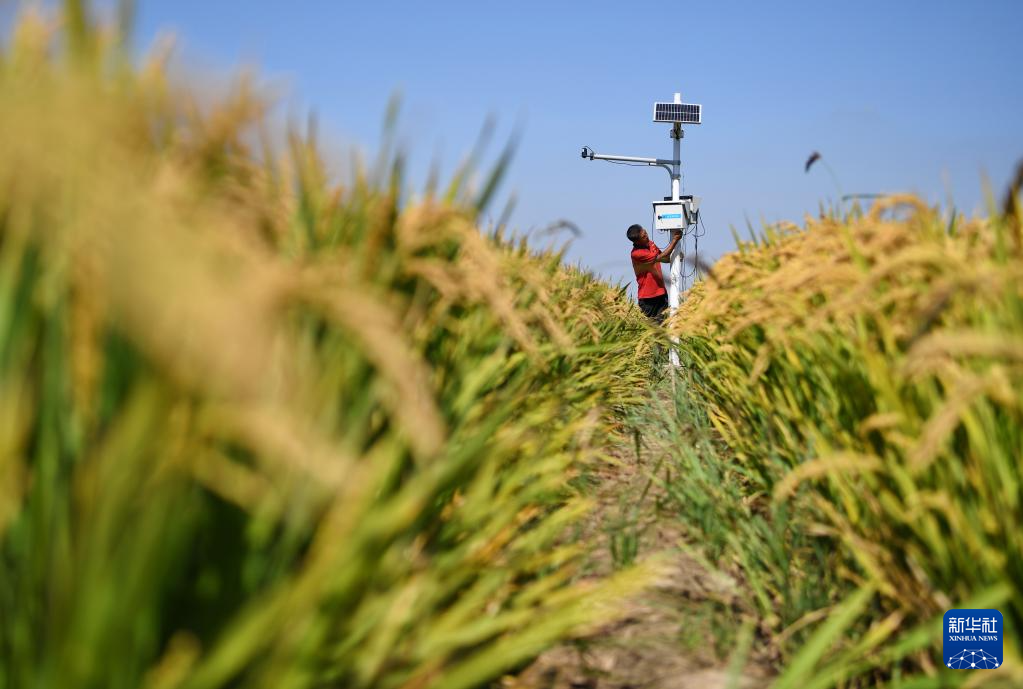 9月14日,在由盐碱地改良而成的乐亭县数字循环农业智慧园区,工作人员在调整水稻田监控设施。