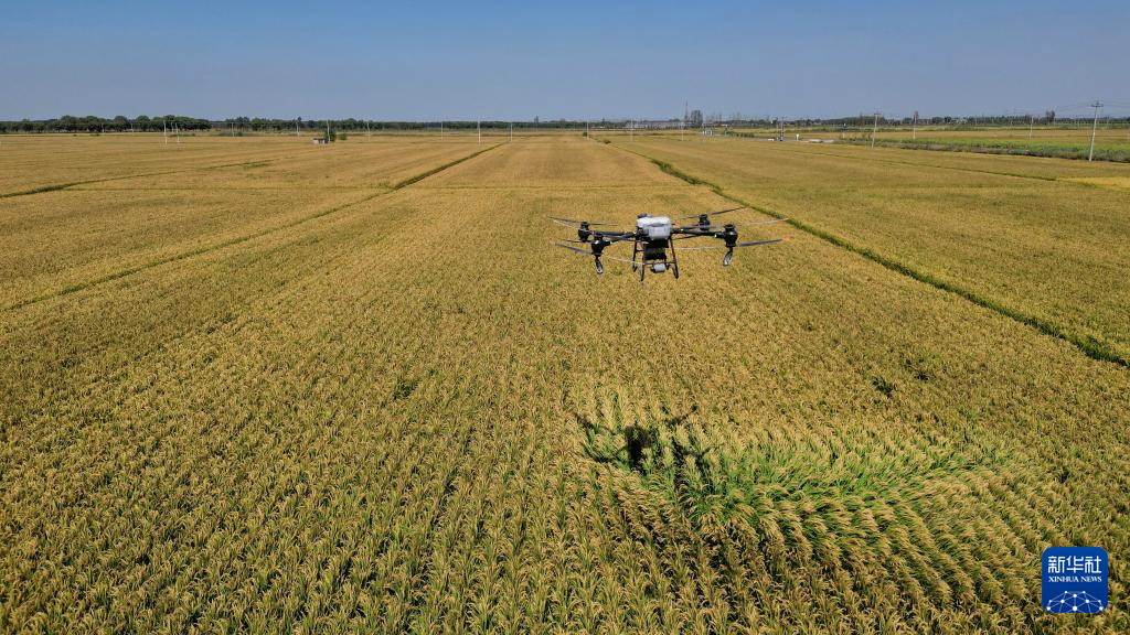 9月14日,在由盐碱地改良而成的乐亭县数字循环农业智慧园区,植保无人机在投放稻田蟹饲料。