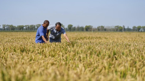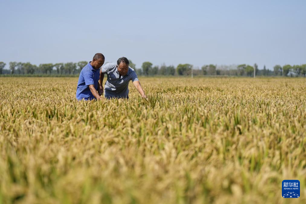 9月14日,河北省乐亭县古河乡农民在由盐碱地改良而成的水稻田内查看水稻长势。