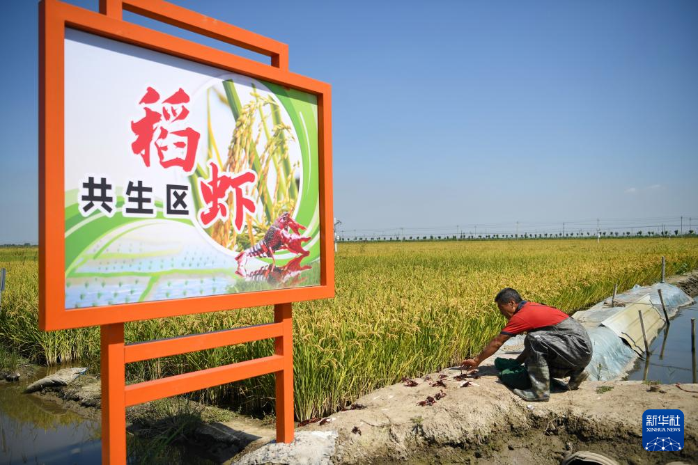 9月14日,在由盐碱地改良而成的乐亭县数字循环农业智慧园区稻虾共生区,工作人员在投放小龙虾。