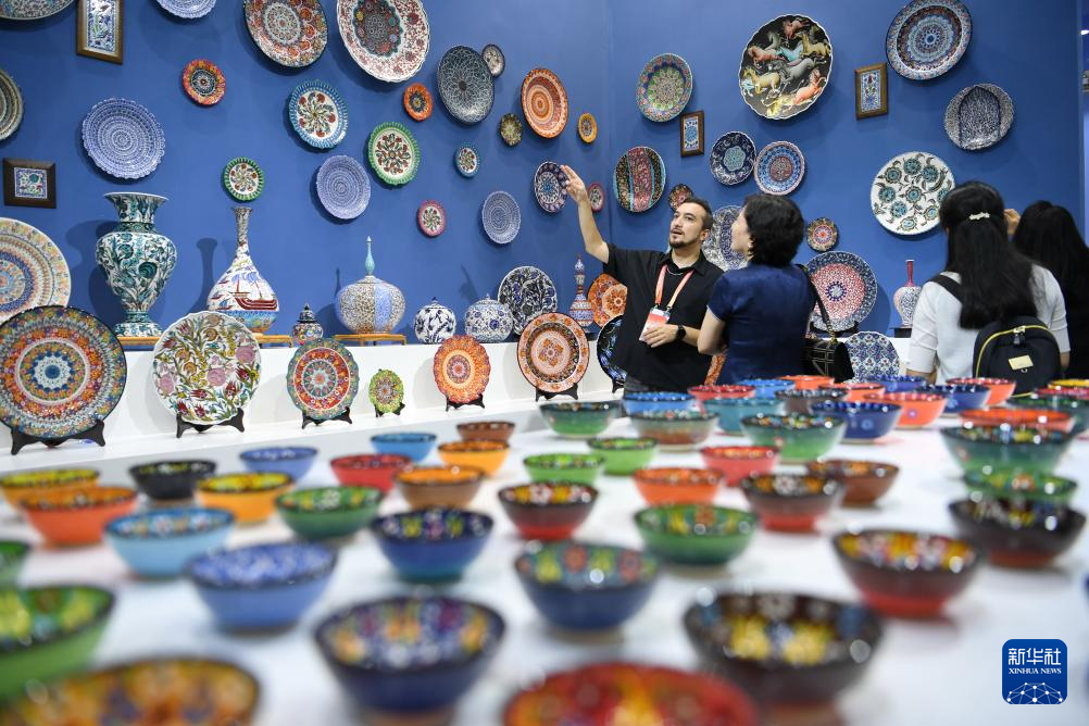 9月16日,来自土耳其的展商在向参观者介绍陶瓷产品。