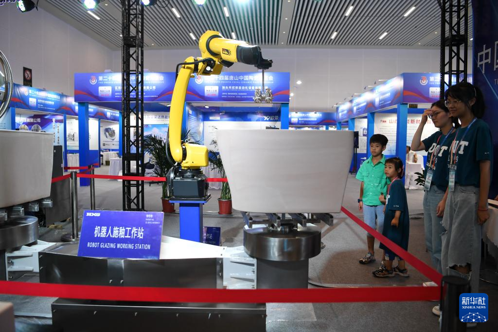 9月16日,参观者在第二十四届唐山中国陶瓷博览会现场参观一款机器人施釉工作站。