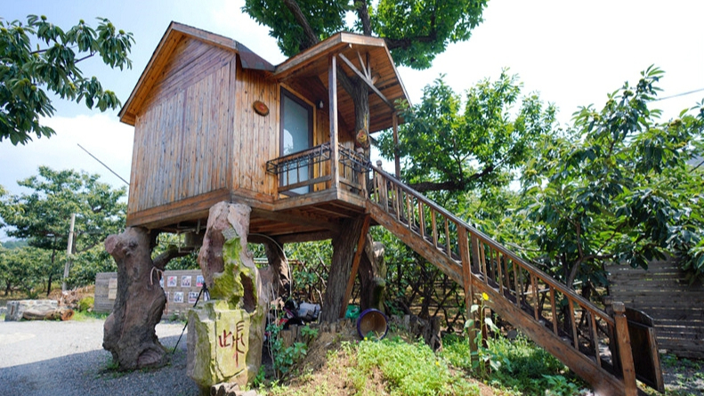 绿树环绕,栗香扑鼻。走进位于唐山市迁西县汉儿庄镇杨家峪村的河北迁西国家板栗公园•归巢部落,只见一座座树屋倚树而建,造型别致,颇具风情。沿着木梯拾级而上,只见屋内宽敞舒适。靠窗而坐,推窗见绿,远眺是山,顿感身心被大自然环绕的宁静惬意。这里,不仅是创始人贾春雷用心经营的一份事业,也是他居住了几十年、热爱了几十年的家。