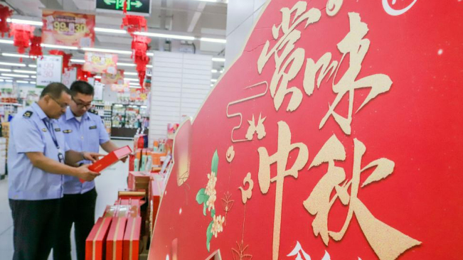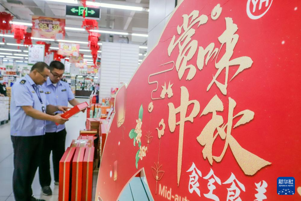9月22日,市场监督管理局的工作人员在河北省遵化市的一家超市检查月饼质量。