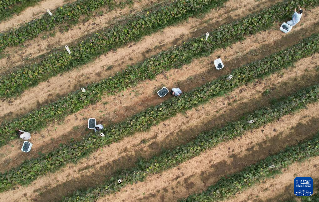 9月25日,河北省卢龙县卢龙镇一家葡萄酒企业的工人在酿酒葡萄种植基地采摘酿酒葡萄(无人机照片)。