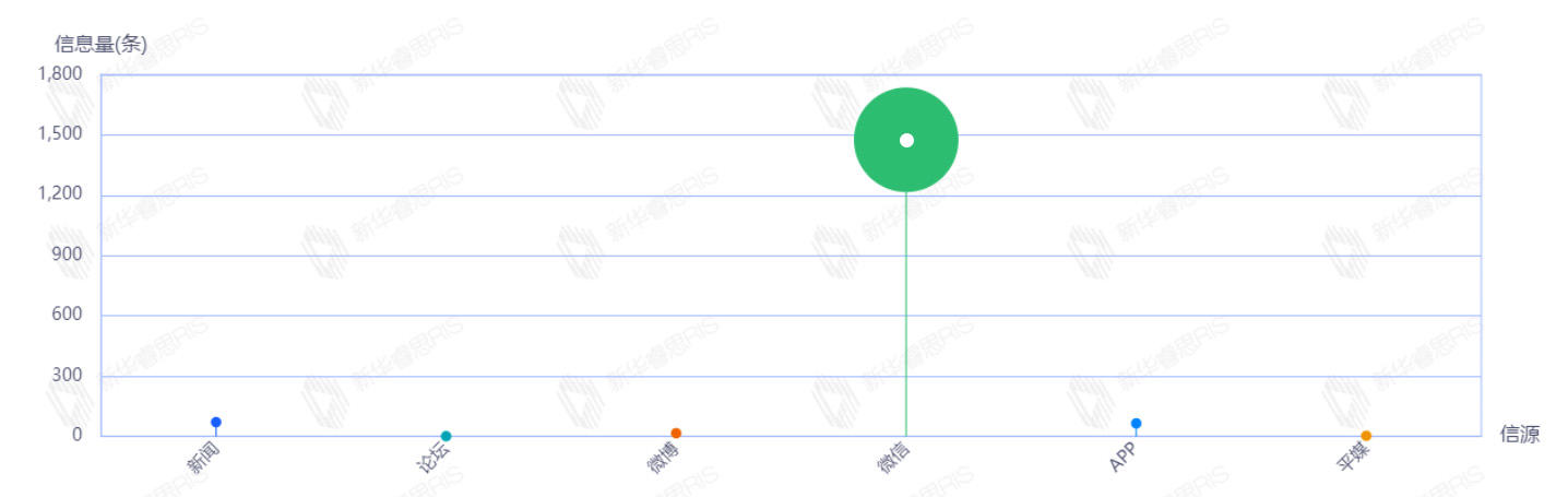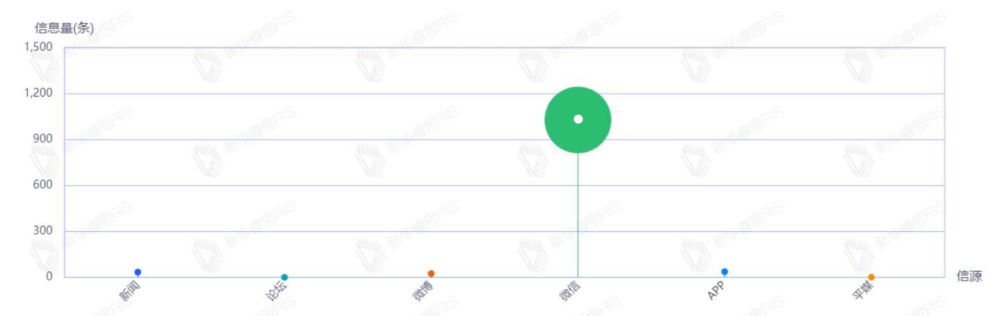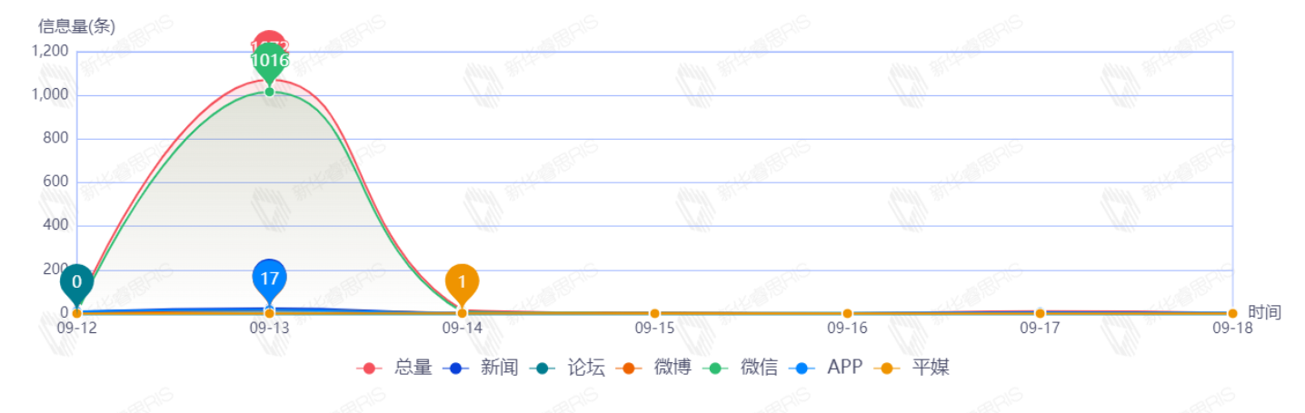 9月12日至9月18日,该文章在互联网上传播总量为1123篇。其中9月13日是信息发布的高峰期,发布信息量为1072篇文章。各信源的信息发布情况中,微信信息占比最大,其次是APP和新闻,信息量分别为1027、37、34,占比分别为91.45%、3.29%、3.03%。(数据来源:新华睿思数据云图分析平台)