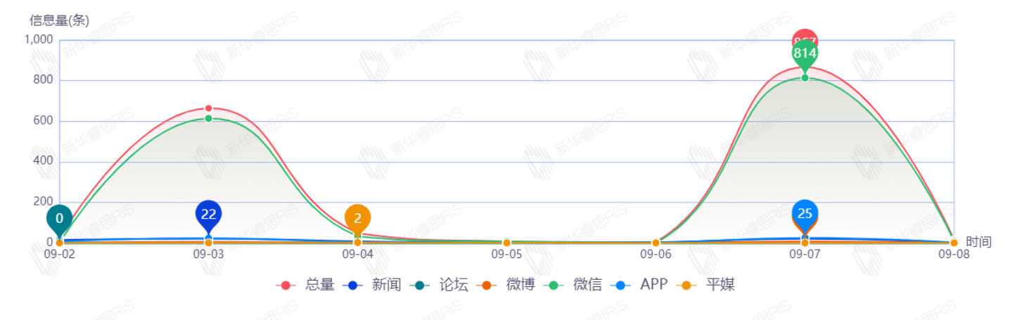 9月2日至9月8日,该文章在互联网上传播总量为1627篇。其中9月7日是信息发布的高峰期,发布信息量为867篇文章。各信源的信息发布情况中,微信信息占比最大,其次是新闻和APP,信息量分别为1476、70、64,占比分别为90.72%、4.30%、3.93%。(数据来源:新华睿思数据云图分析平台)