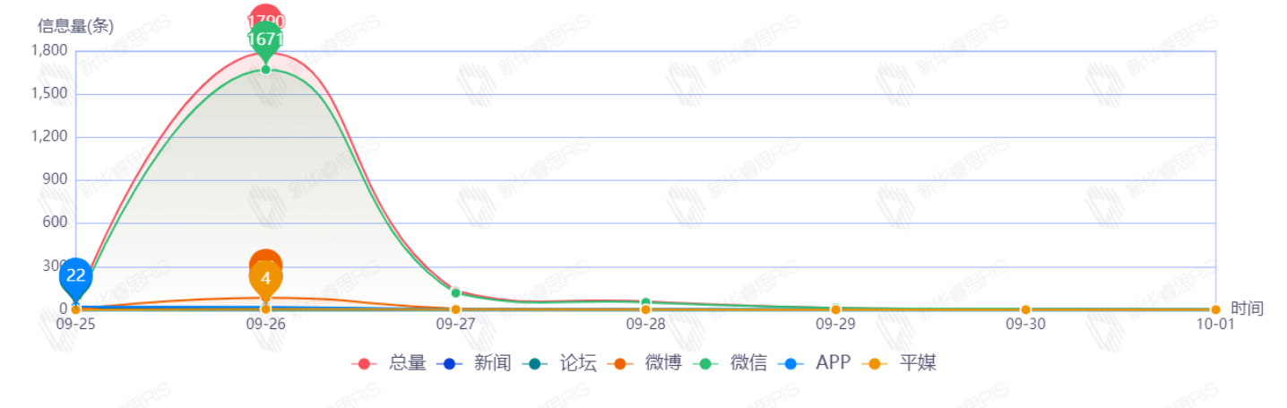9月25日至10月1日,该文章在互联网上传播总量为2039篇。其中9月26日是信息发布的高峰期,发布信息量为1790篇文章。各信源的信息发布情况中,微信信息占比最大,其次是微博和APP,信息量分别为1862、96、50,占比分别为91.32%、4.71%、2.45%。(数据来源:新华睿思数据云图分析平台)