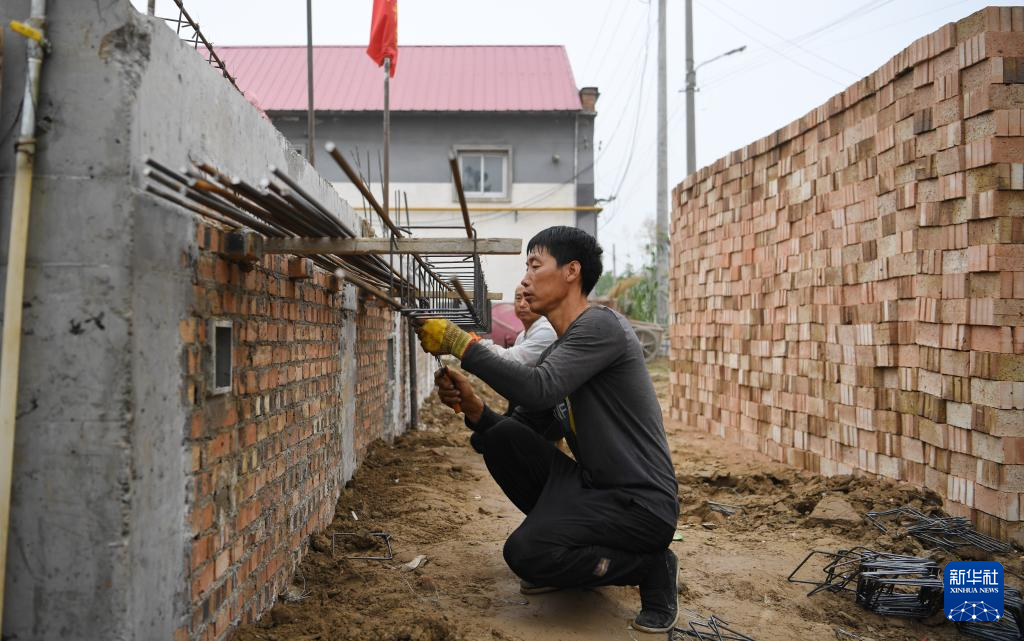9月26日,工人在河北保定涿州市刁窝镇刁四村一处受损房屋重建现场作业。