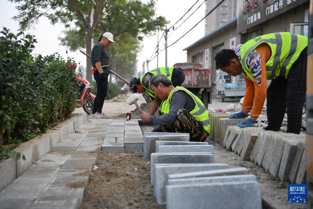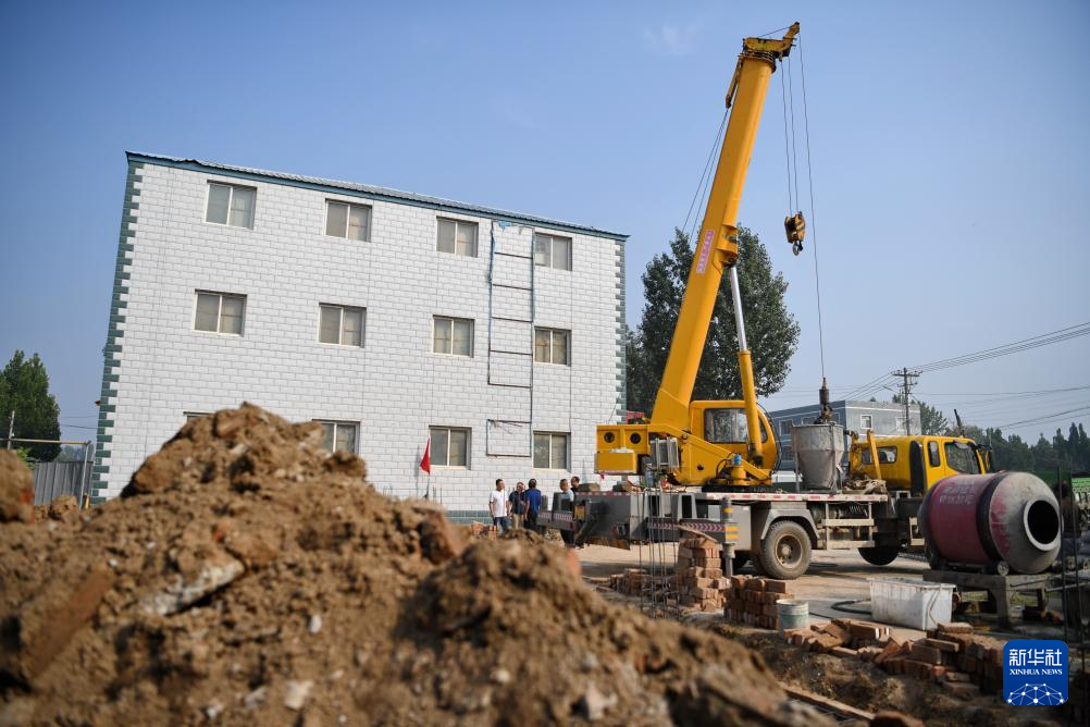 9月27日,工人在河北保定高碑店市善巨庄村一处受损公共场所重建现场施工。