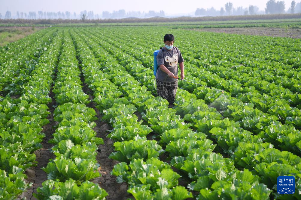9月26日,河北保定涿州市刁窝镇潘各庄村农民在补种的白菜地里喷洒农药。