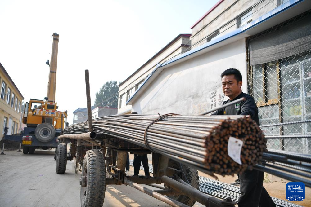 9月26日,工人在河北保定涿州市刁窝镇刁四村一处受损房屋修复现场搬运钢筋。