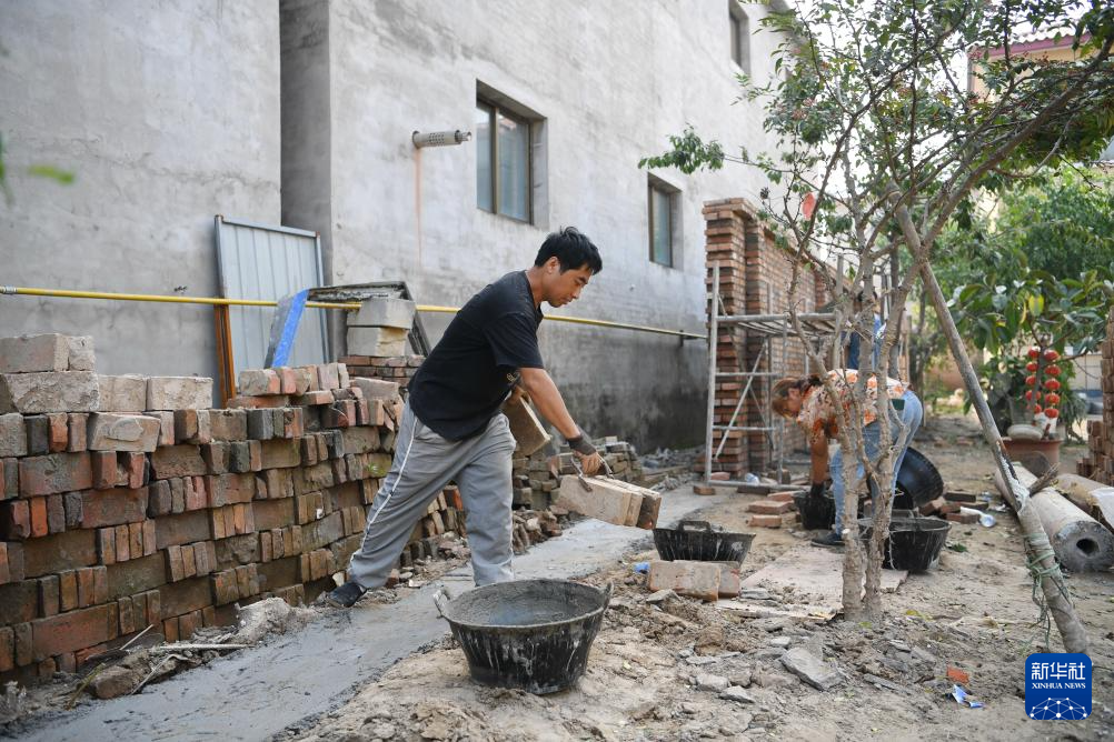 9月26日,工人在河北保定涿州市刁窝镇刁四村一处受损房屋修复现场搬运砖块。