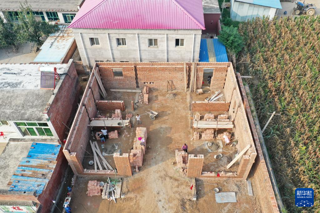 河北保定涿州市刁窝镇刁四村一处受损房屋重建现场(9月26日摄,无人机照片)。