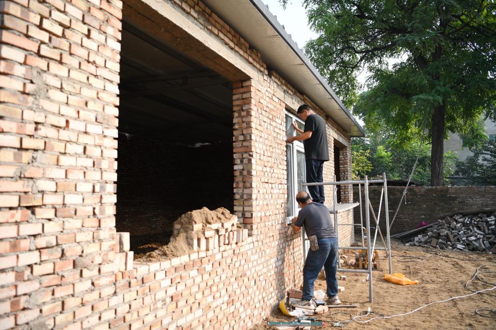 9月26日,工人在河北保定涿州市刁窝镇刁四村一处受损房屋重建现场安装窗户。