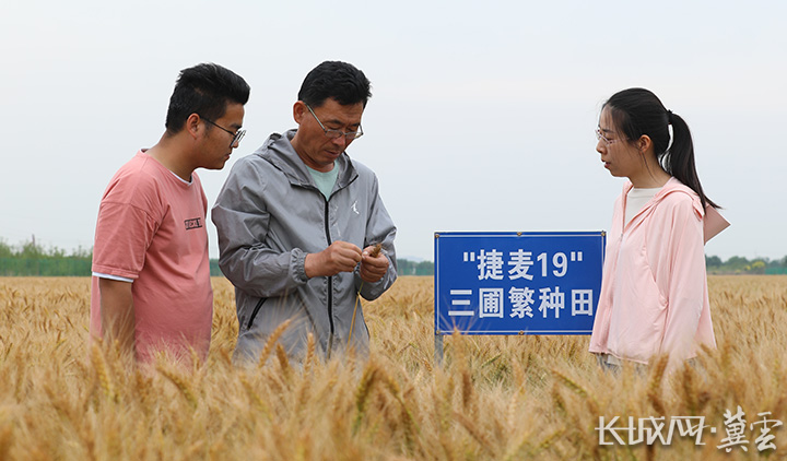 中捷产业园区农科所副所长张卫军(中)带领团队育成“捷麦19”并进行试种。长城网·冀云客户端记者 李佳琦 摄