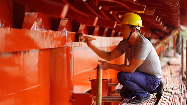 10月14日,工人在顺德府文庙大成殿进行施工作业。