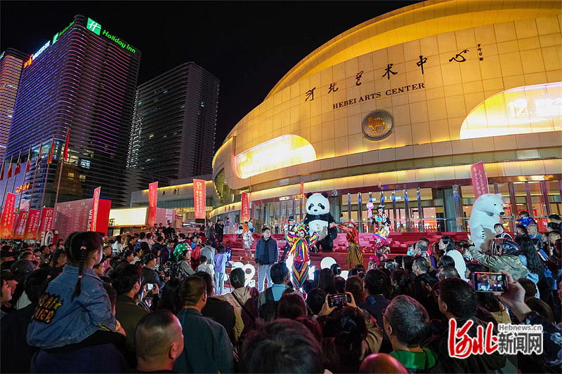 夜幕即将降临,河北省艺术中心前广场彩旗飘扬,“第十九届中国吴桥国际杂技艺术节”的造型灯亮起,随着欢快动感的音乐,一场滑稽表演为当晚的杂技广场活动启幕,两位演员身着熊猫和北极熊造型的人偶服装,边跳舞边与观众互动,吸引了不少大小朋友跟着舞动。随后,舞狮表演,杂技《太空漫步》《呼啦圈》《顶花坛》,魔术《鸽剧魅影》等节目轮番登场,演员们的精彩表演赢得观众阵阵掌声。节目《快乐炊事员 》把炊具当道具在演员手中玩出不同新花样,节目《蹬技》演员蹬坛子、蹬桌子,做出各种高难动作……惊险刺激、好玩好看的节目不断把现场气氛推向高潮,《变脸》节目更是让观众叫好声不断,特别是在演出最后,多位滑稽小丑演员带来的气球、草帽、高跷、独轮车等表演,并与观众互动,现场欢笑声不断。