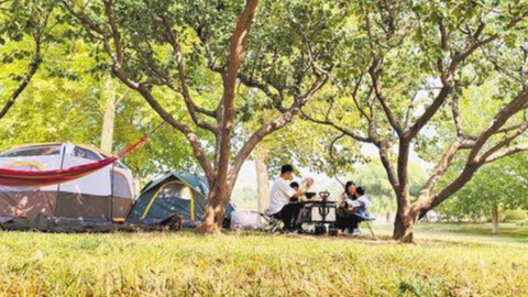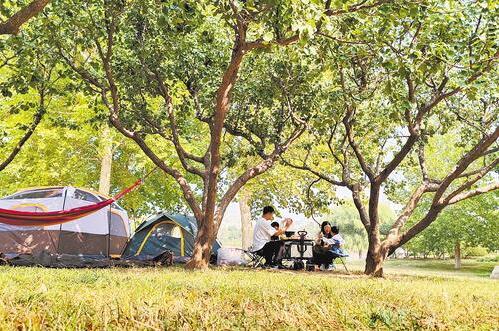 10月14日10时许,一处开阔的草地上,市民杨丽一家人搭上露营帐篷,支起简易的桌椅,煮上一杯热茶,悠闲地欣赏着公园的美景。