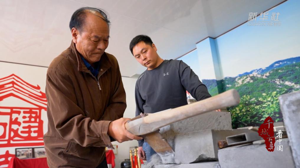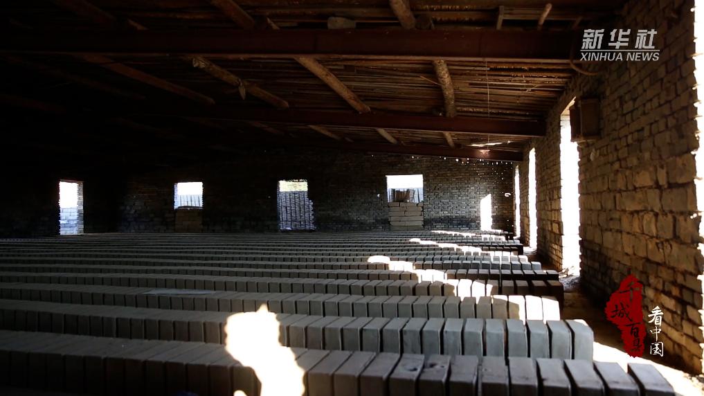 在河北省任丘市出岸镇古建砖厂车间内,古建青砖制作技艺传承人正在将出窑的条形青砖进行“砍砖磨平”处理。