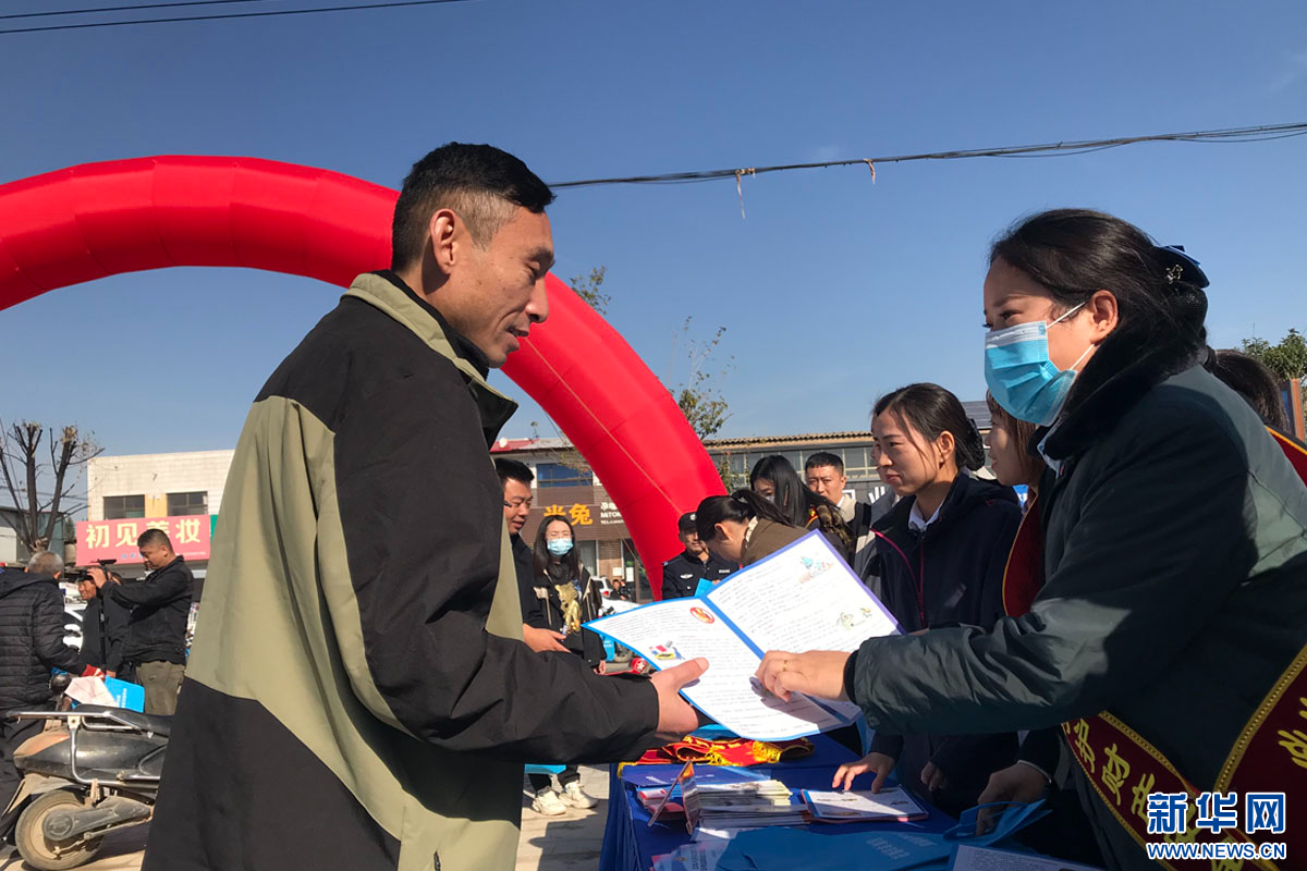 工作人员向村民介绍防范非法集资知识。新华网 高丽摄