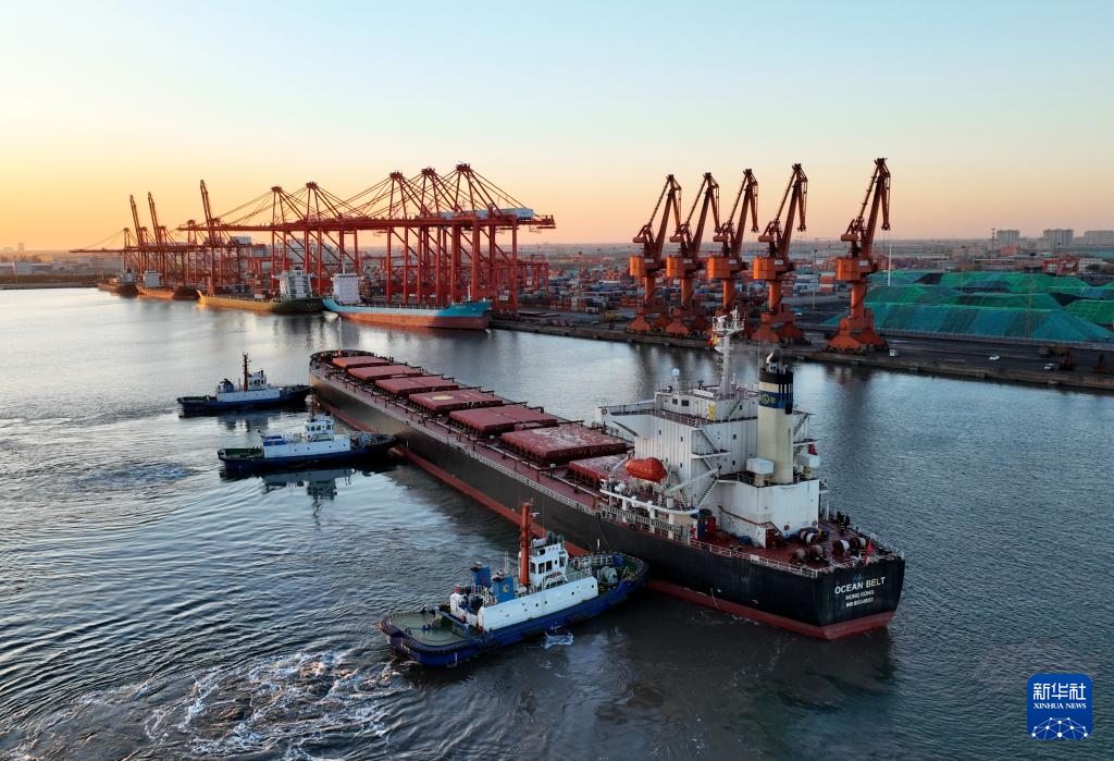 11月11日,一艘轮船在拖轮的协助下向唐山港京唐港区矿石码头靠泊(无人机照片)。