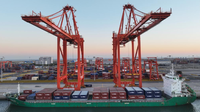 11月11日,一艘轮船靠泊在唐山港京唐港区集装箱码头装货(无人机照片)。