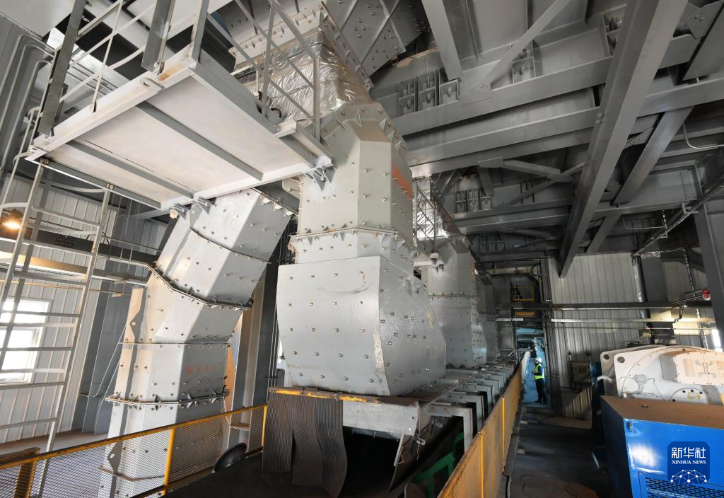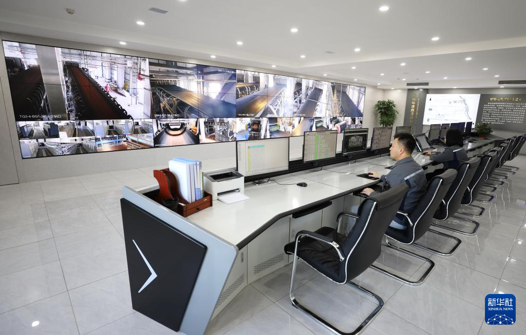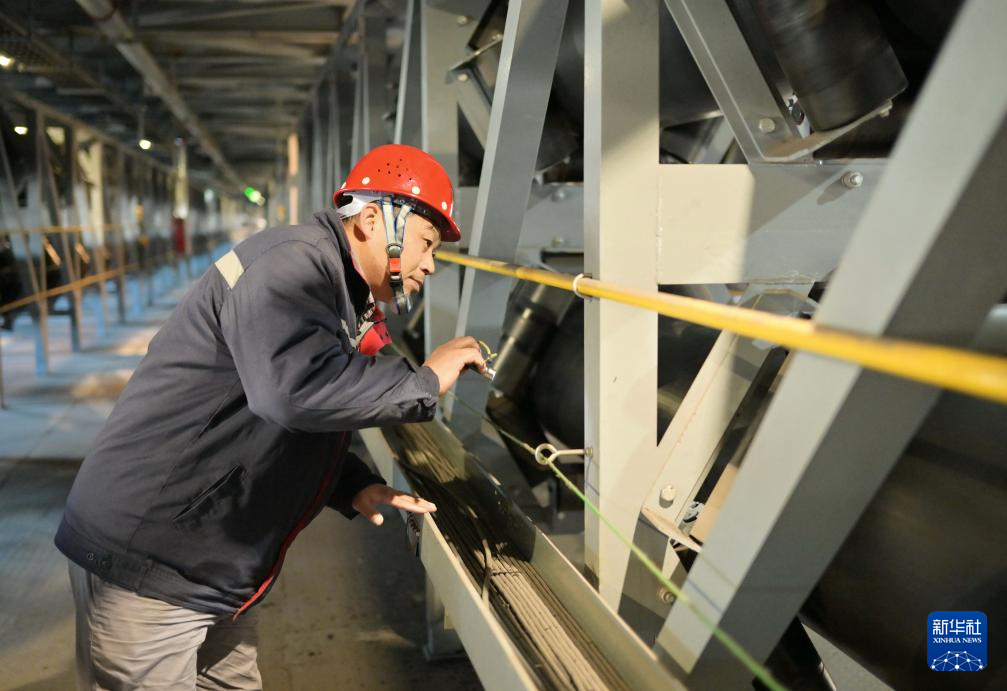 11月12日,工人在唐山海港经济开发区管带机廊道转接机房查看矿石输送情况。