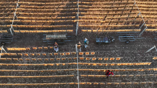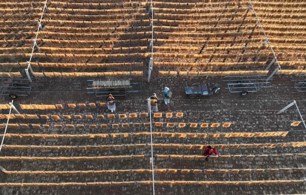 11月17日,河北省遵化市平安城镇一家传统手工粉条加工合作社的社员在晾晒粉条(无人机照片)。